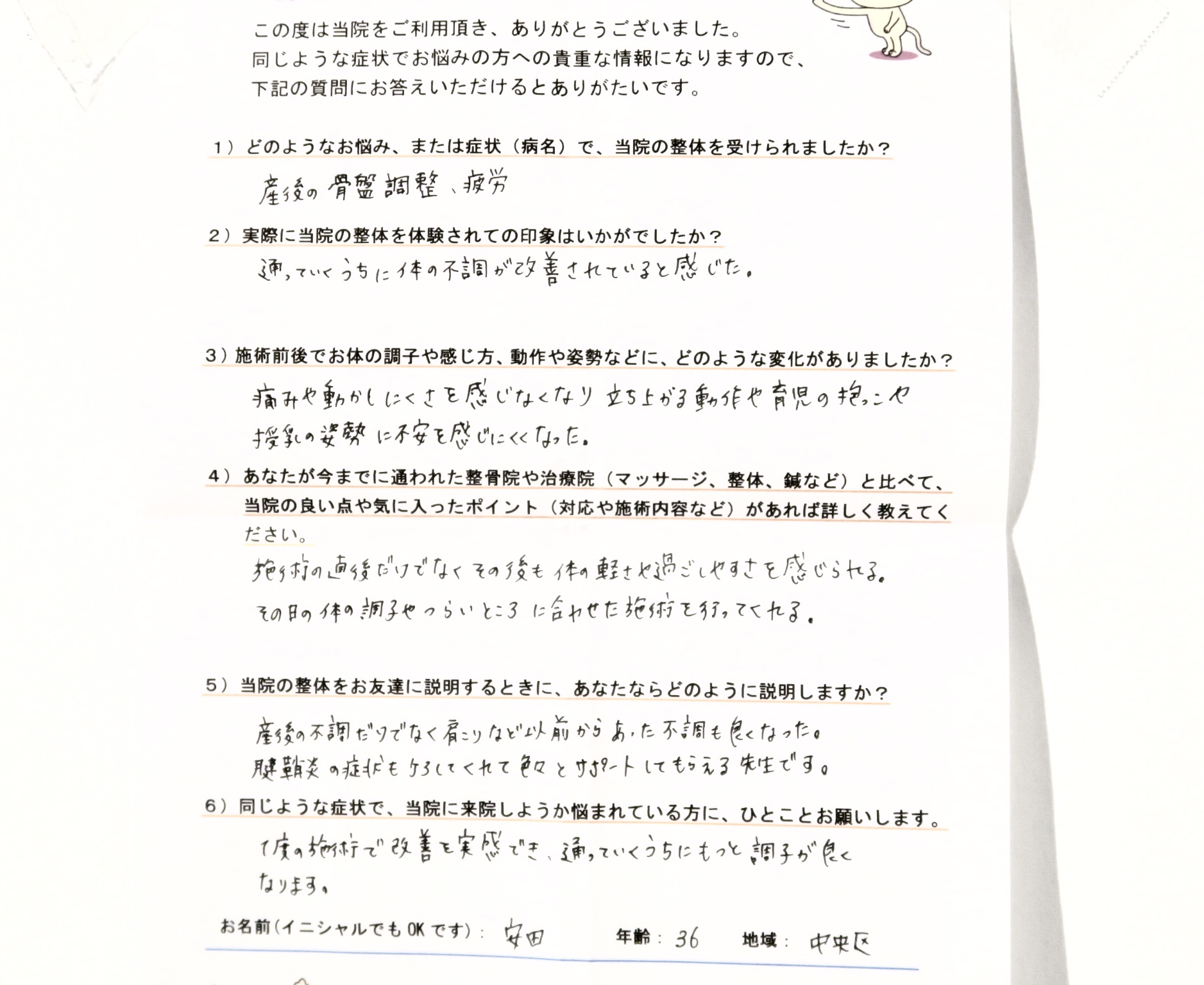 産後の不調だけでなく肩こり腰痛など以前からあった不調も良くなった。